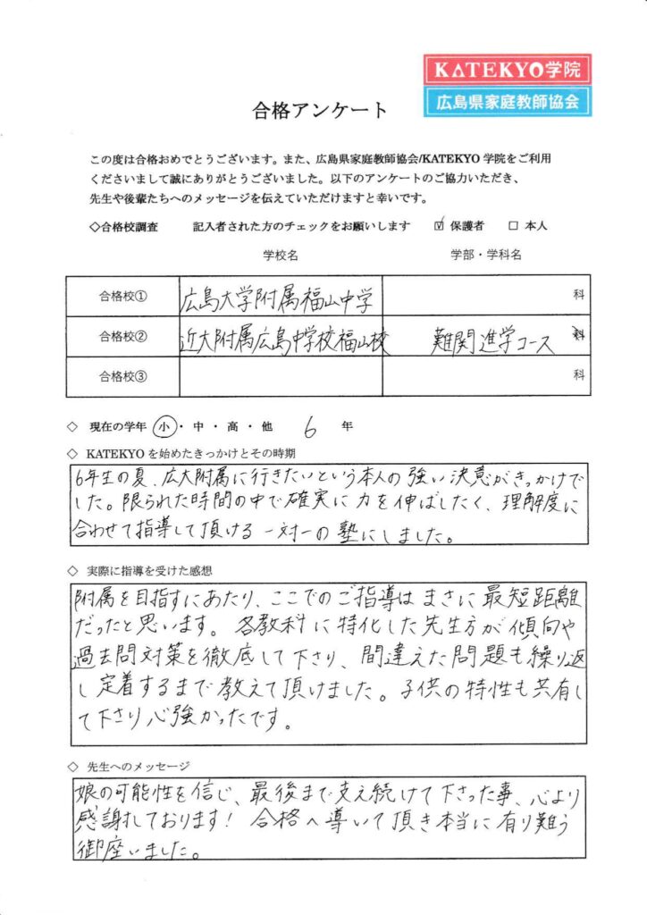 次の生徒さんは6年生の夏から、本人の広大附属へどうしても行きたいという「強い決意」をきっかけに、理解度にあわせて指導してもらえる1対1のKATEKYOに入会された方です。各教科の専門の先生が、出題傾向に合わせた対策を定着するまで繰り返し指導を行い、見事に合格を勝ち取られました。