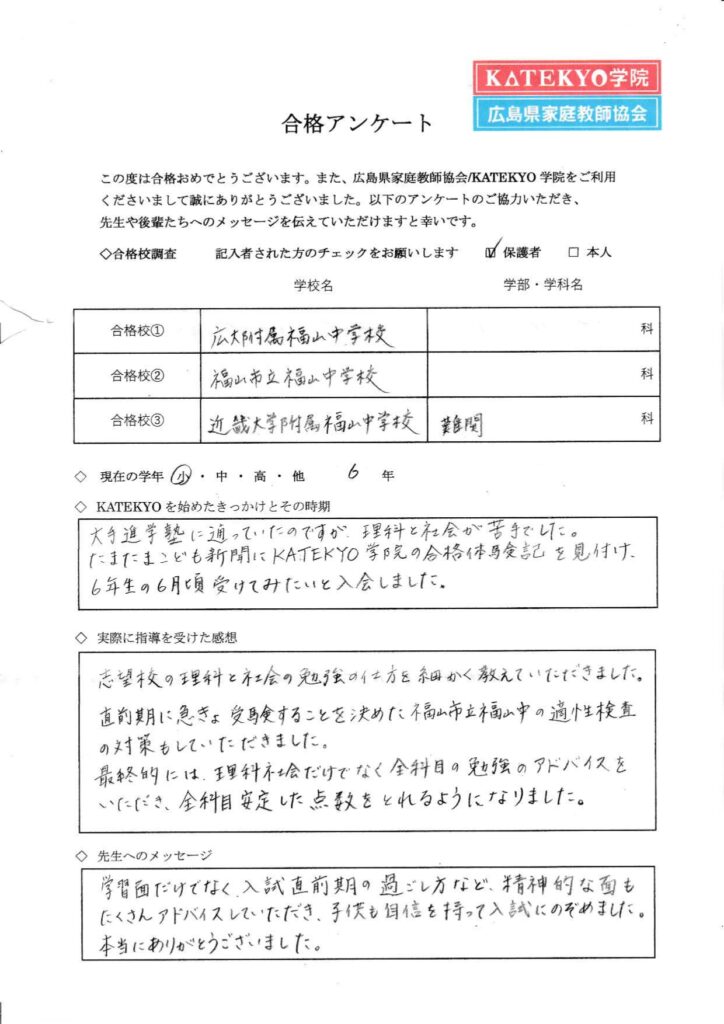 今回ご紹介の2名は、いずれも平田先生(当社正社員教師)が担当した生徒さんになります。適性検査対策も得意としている先生ですので、来年度広大附属受験をお考えの生徒さんも是非体験指導でお試しください!