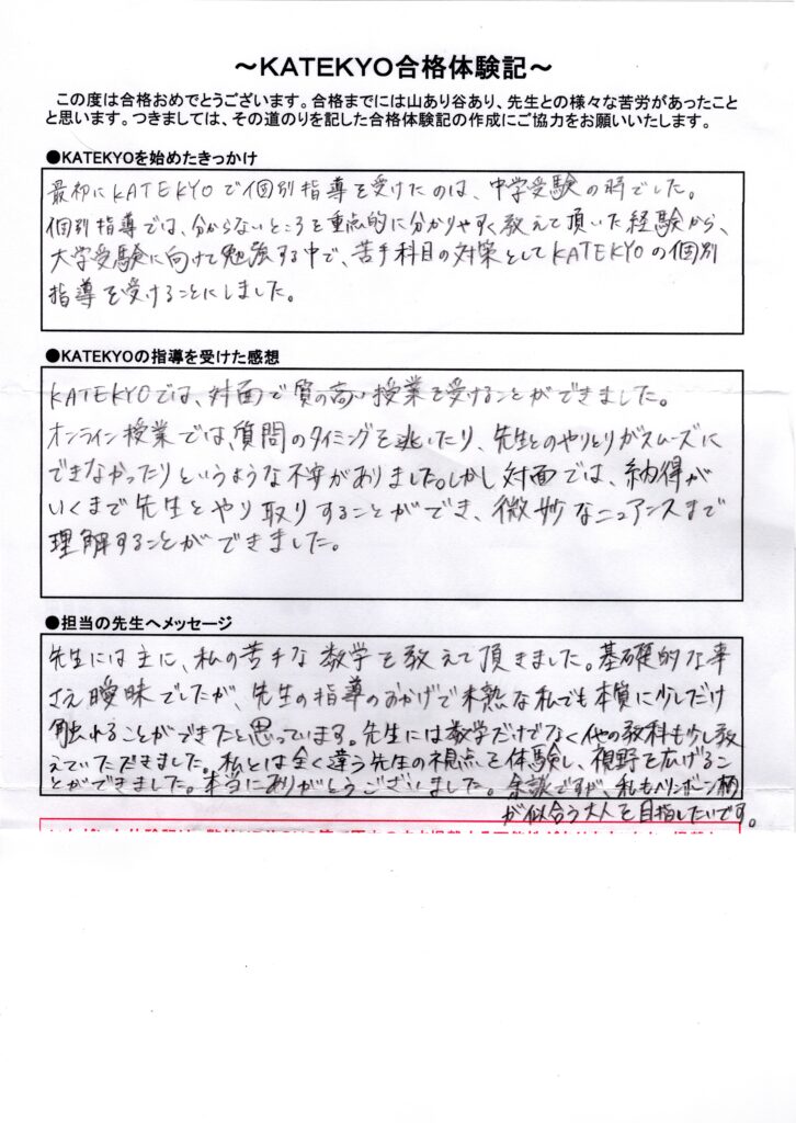 東京女子医科大学(医学部)合格 2026 3/27 倉敷事務局 倉敷駅前校 Sさんは小学生の時に中学受験対策でKATEKYOに通っていただき、高校生になって再び医学部受験を目指して通ってくれました。主に数学や物理・化学などの科目を指導させていただき、難易度の高い問題に数多くチャレンジしてきました。夢であった医師になるため努力を惜しまなかった姿は大変すばらしく、小学生の頃からは大きく成長した姿を見せてくれました!